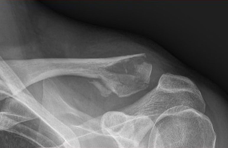 These fractures generally occur due to a fall directly onto the shoulder or a fall onto an outstretched hand. One generally feels a crack or acute pain through the outer end of the collarbone. There’s generally swelling and bruising and in a lot of cases an obvious deformity or lump on top of the shoulder. This is usually due to the bone displacing upwards and often backwards. The shoulder is often painful and a clicking sensation is often felt.