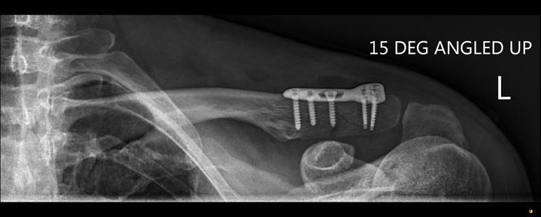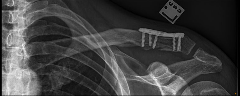 This 23 year old fell when playing soccer and managed to shatter his clavicle into 5 pieces. Five weeks following his surgery his fracture had almost completely healed and he had a good range of motion. Three months after his operation he had a normal shoulder again, the clavicle fracture was solidly healed and he was a happy man.